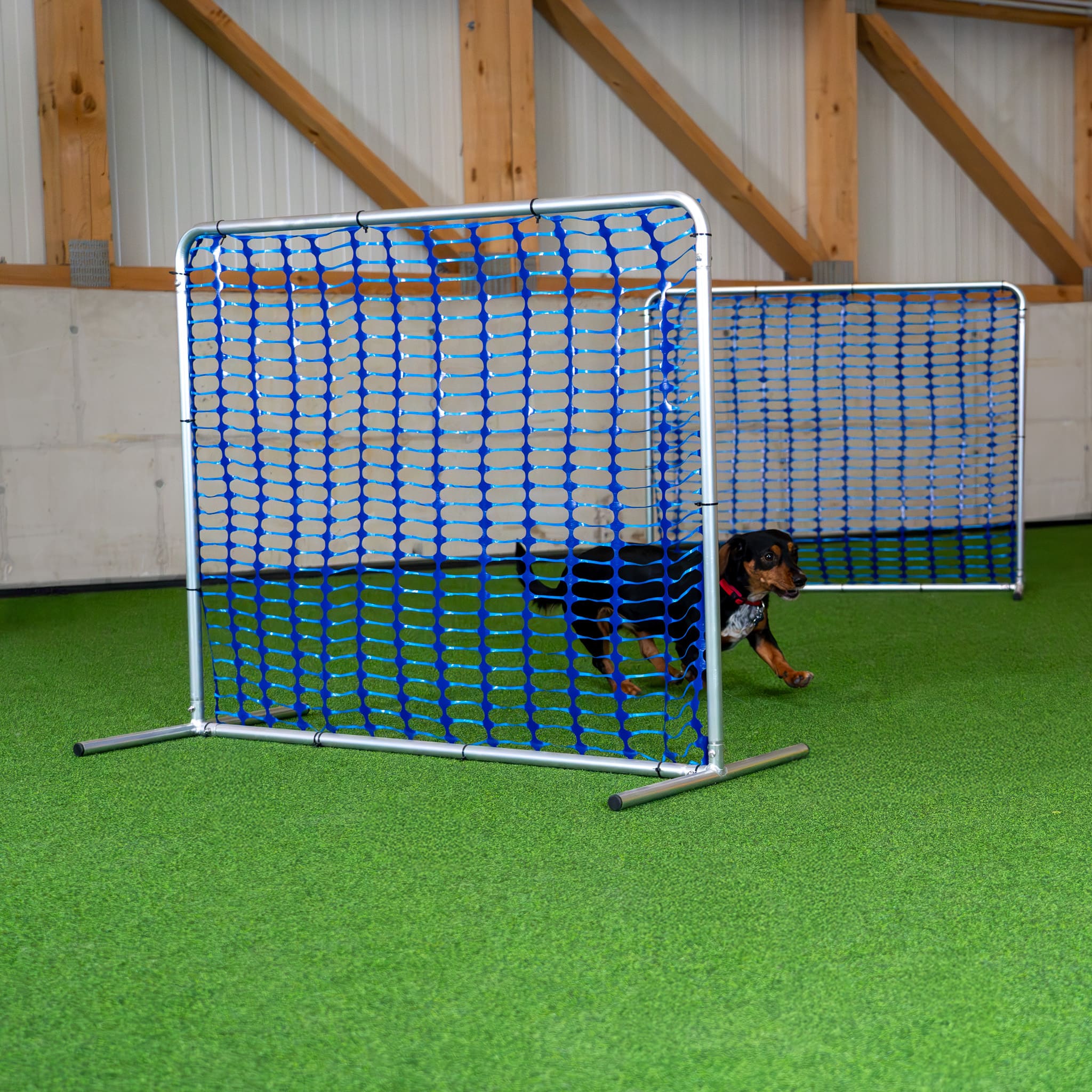 Das blau eingefärbte Netz hebt sich deutlich vom Hintergrund ab, sodass der Hund die Begrenzung klar erkennen kann